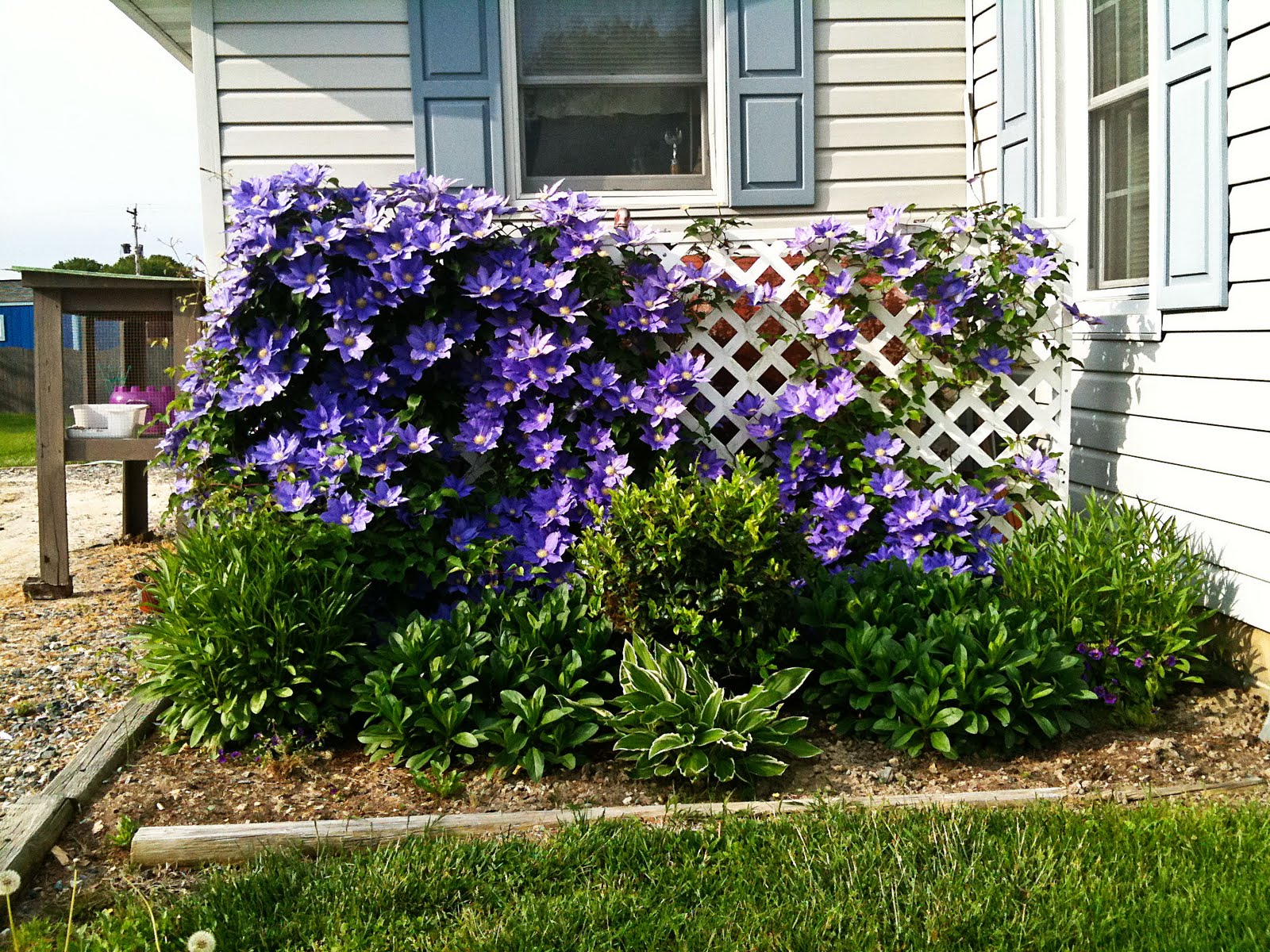 We love to garden. When we moved into this little bungalow our second item on the to-do list was garden and flowerbeds. The first year we had an anemic garden that produced an insane amount of tomatoes (that was the only thing that grew in the wire grass) which we canned into salsa, soup and whole tomatoes. And then stopped looking at them. We told other people to come get them because there were so many. We also put a bunch of annuals in the flowerbeds around the foundation plantings. We also purchased a couple two clematis plants to cover the oil tank and a couple of salvia plants.